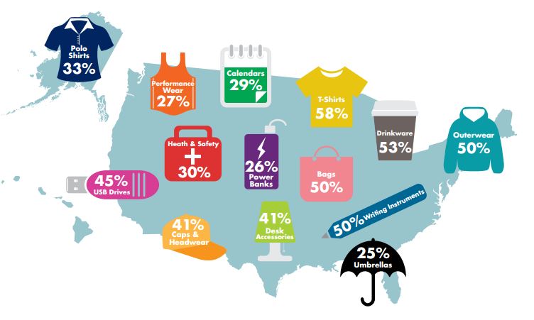 The top items, promotional t-shirts at 58%, custom drinkware (53%) and outerwear, bags and writing instruments (all three at 50%) have been fairly steady in the US. But the numbers can vary quite a bit based on demographics / geography.