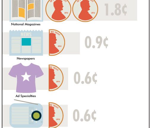 Impressions, a long standing metric, tend to be come into play with awareness and retention efforts. As part of the ASI annual study on specialty products (promotional products), they conduct a cost analysis on impressions. Promotional products are among the second lowest cost per impression for major marketing efforts. We ‘swiped’ the below infographic from ASI Central to show you the relative costs for the different media.